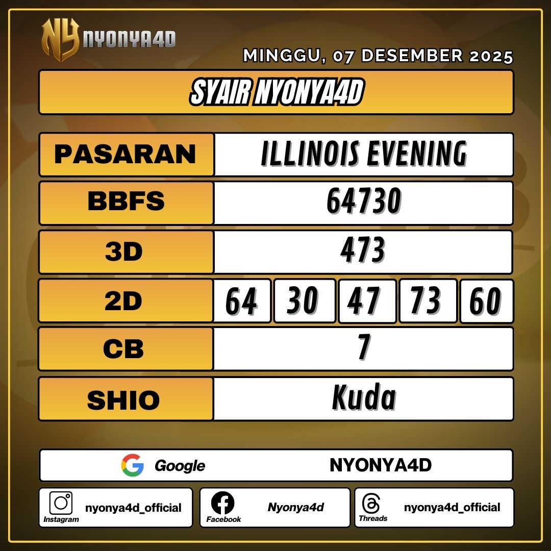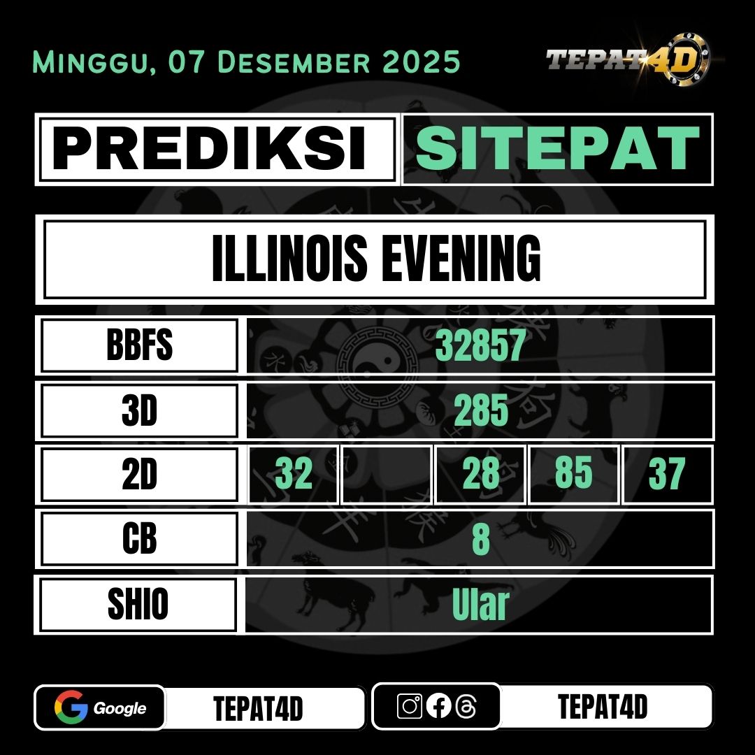 Data Keluaran dan Paito Warna Illinois merupakan kumpulan result yang diambil dari website resmi www.illinoislotterynumbers.net dengan tujuan untuk mempermudah master-master dalam meracik rumusan angka di pasaran Illinois Evening. Result Pasaran Illinois Evening setiap hari di jam 09:20 WIB