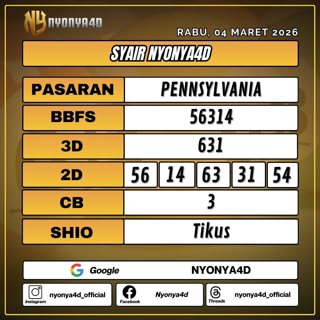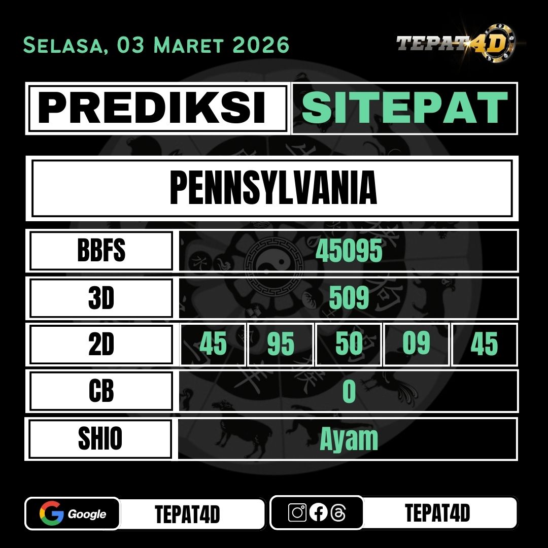 Data Keluaran dan Paito Warna Pennsylvania merupakan kumpulan result yang diambil dari website resmi www.usatoday.com/lottery/us-pa dengan tujuan untuk mempermudah master-master dalam meracik rumusan angka di pasaran Pennsylvania. Result Pasaran Pennsylvania Evening setiap hari di jam 05:58 WIB