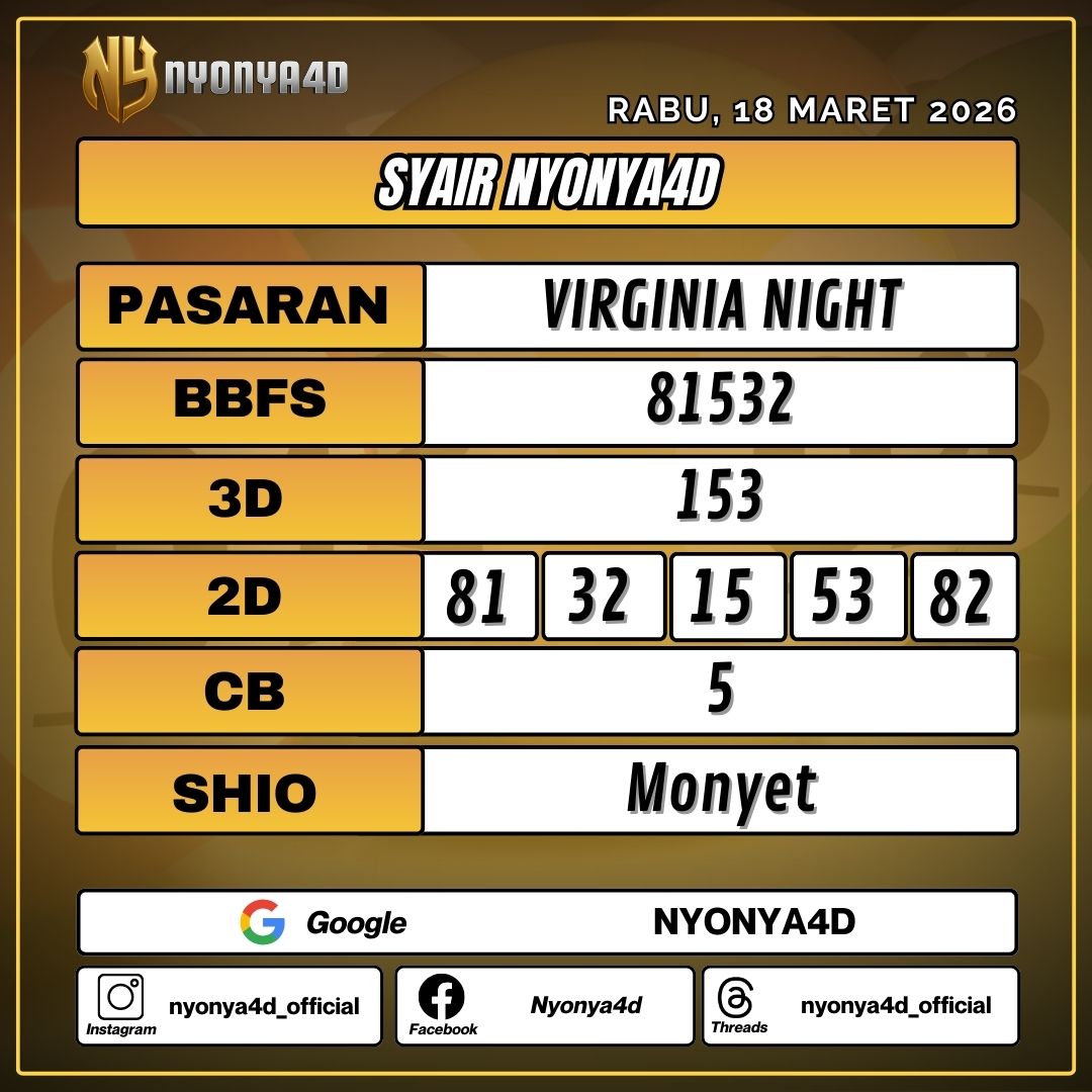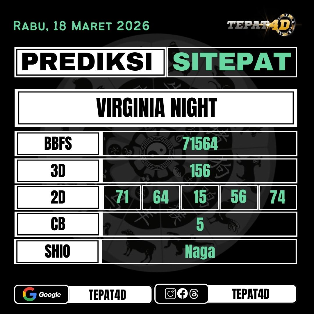Data Keluaran dan Paito Warna Virginia merupakan kumpulan result yang diambil dari website resmi https://www.usatoday.com/lottery/us-va dengan tujuan untuk mempermudah master-master dalam meracik rumusan angka di pasaran Virginia Night. Result Pasaran Virginia Night setiap hari di jam 10:00 WIB